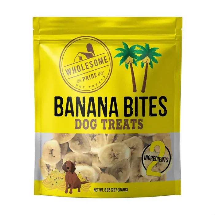 Wholesome Pride Banana Bites Dog Treats are grain-free and gluten-free and are intended to be used for intermittent or supplemental feeding only. They are minimally processed and are a great option for dogs with food allergies and sensitive stomachs.